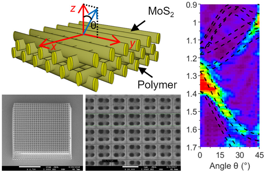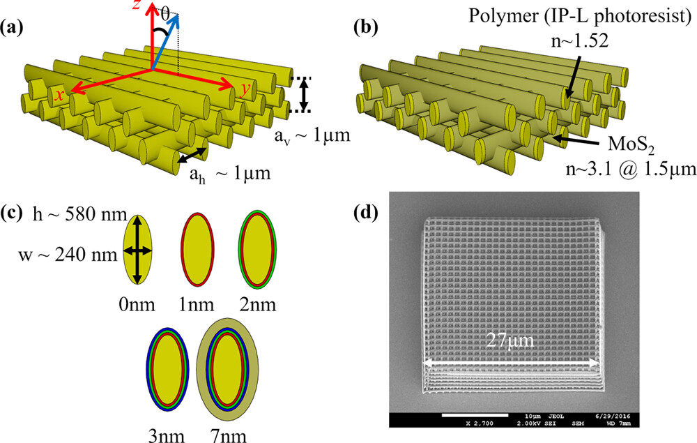 Photonic Bandgap; Photonic Cyrstals; Woodpile Based Photonics I am currently interested in the field of photonic bandgap engineering. A recent paper I co-authored explores the modification of photonic band structures and dispersion control in the development of functional photonic devices. The study involved fabricating composites of photonic crystal templates with high-refractive-index material using a two-step process. By depositing MoS2 films onto 3D polymeric woodpile templates, we observed red-shifts in partial bandgaps in the near-infrared region. Each 1 nm increase in the thickness of the deposited MoS2 thin film resulted in a measured red-shift of approximately 10 nm in the fundamental and high-order bandgaps. These findings provide insights into utilizing conformally coated polymeric templates for enhancing the nonlinear optical responses of materials, offering potential applications in 3D all-optical switching for efficient memory devices. Publications: